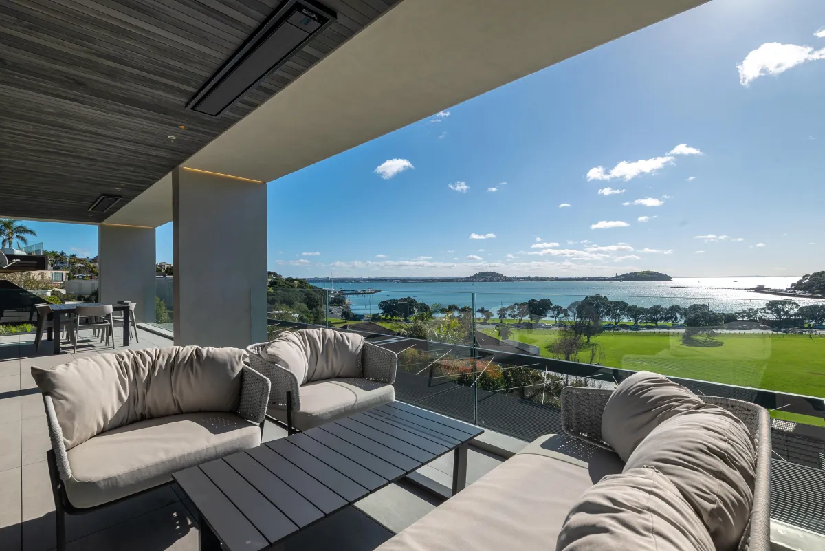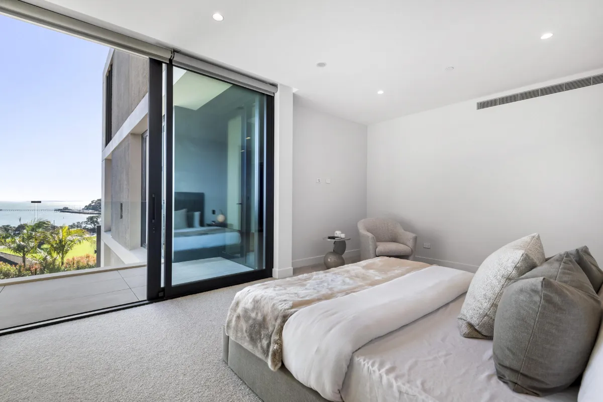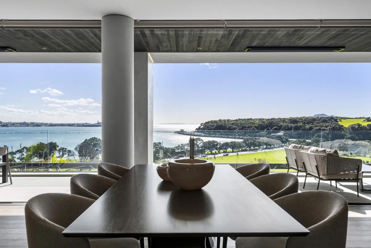 An exclusive residence designed to embrace the spectacular natural landscape of Ōkahu Bay, imbued with the quiet grandeur of Simon Elvidge's unique architectural design. This ground-floor apartment offers seamless indoor-outdoor flow with expansive wraparound terraces capturing panoramic views of Ōkahu Bay, the Hauraki Gulf, and Rangitoto—perfect for relaxed entertaining or quiet retreats.